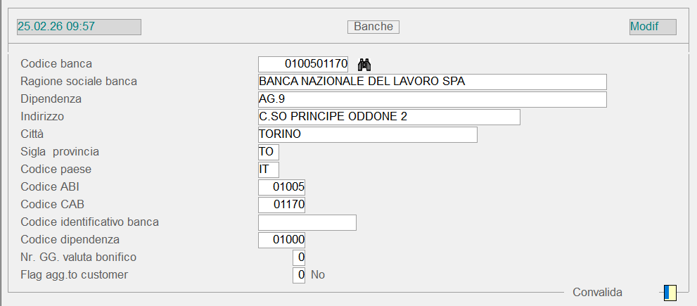 È consigliabile adottare questo tipo di codifica perché permette al programma di rilevare automaticamente, a partire dal Codice Banca, i codici ABI e CAB e quindi inserirli nei rispettivi campi.