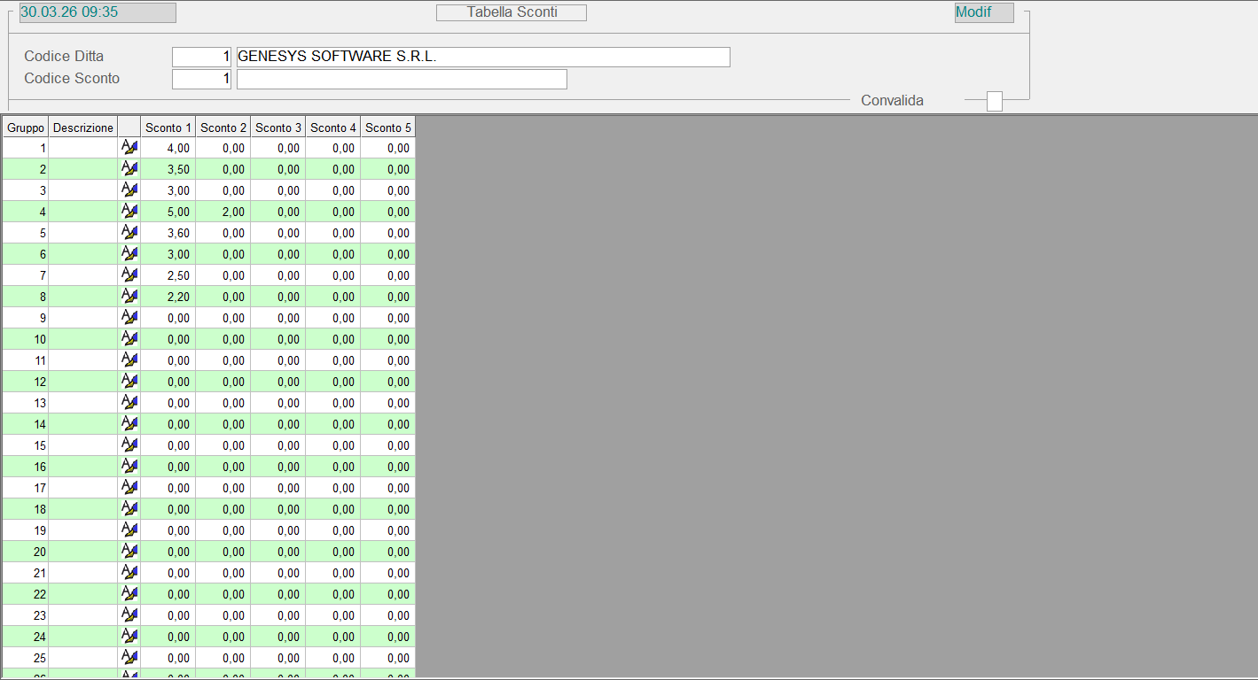 La Gestione degli Sconti è subordinata alla valorizzazione di questa tabella, in cui definire le condizioni di sconto riservate ai Clienti/Fornitori oppure da applicare agli Articoli. La tabella può contenere fino ad un massimo di 80 Gruppi Sconto differenti, con conseguente possibilità di associare, a ciascun Cliente/Fornitore oppure Articolo, un'ampia scontistica. Gli 80 Gruppi Sconto sono visibili in un'unica videata in formato data-grid e l'Utente può assegnare, a ciascuno di essi, un'eventuale Descrizione.
