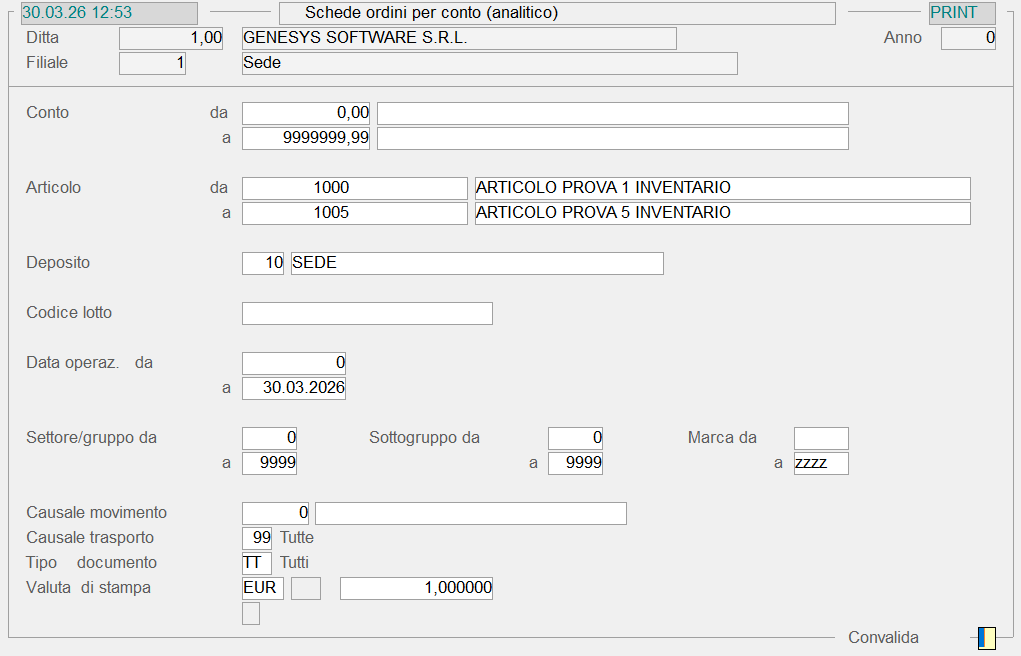 La Scheda Ordini per Articolo fornisce in ordine cronologico, tutta la movimentazione relativa ad ogni Articolo del range impostato dall'Utente. A livello di menù è possibile selezionare la stampa Con o Senza Valori: quest'opzione si traduce nella possibilità d'includere o escludere la colonna del Valore; un'ulteriore selezione, consente poi di scegliere tra la stampa Analitica e la stampa Sintetica.