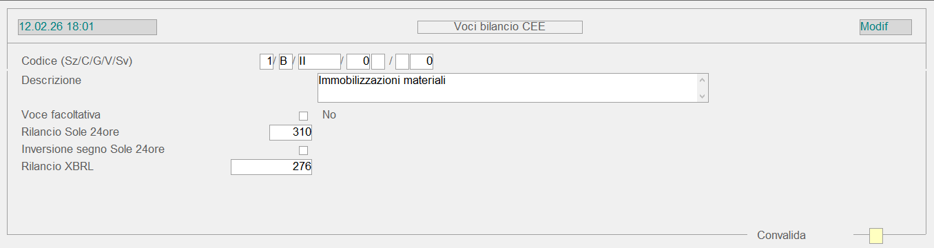 Questo check-box, se attivo, comporta l'inversione di segno ai fini del Bilancio nel formato Il Sole 24 Ore. Può essere attivato solo se risulta impostato il campo Rilancio Il Sole 24 Ore (campo precedente).