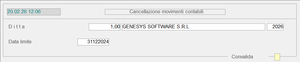 L'accesso alla fase di cancellazione richiede solo l'impostazione della Ditta e della Data limite, come evidenzia la videata di seguito riportata: