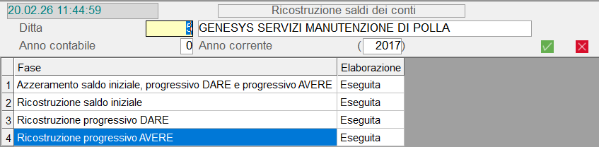 Questa funzione permette di ricostruire i Progessivi Anno corrente e Anno precedente (Saldo iniziale e Dare/Avere) di tutti i Conti di Contabilità Generale, assumendo i dati dai movimenti contabili.
