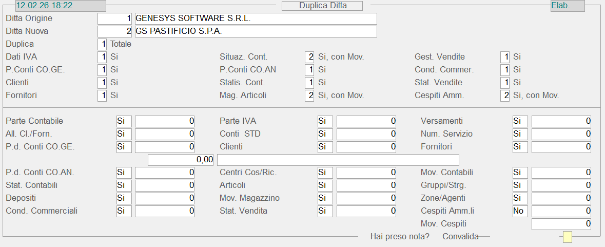 Indicano rispettivamente il codice della ditta che si desidera duplicare e quello della ditta di destinazione.