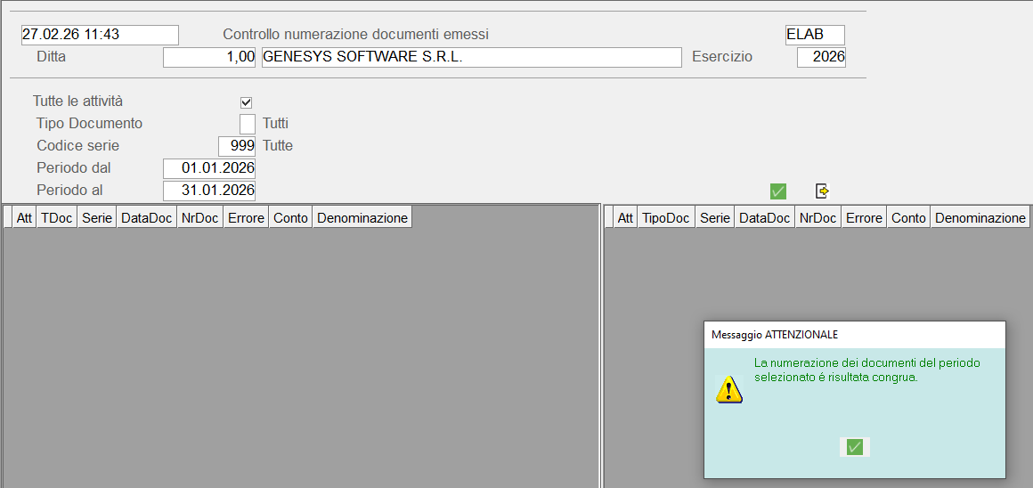 Le fatture, una volta importate, è necessario controllare la sequenza della numerazione mediante la funzione:B20\3.10 Fatture elettroniche attive\6 Controllo documenti emessi\4 Numerazione documenti