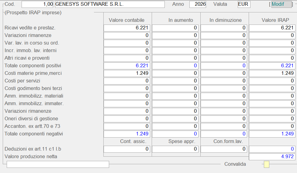 É prevista la possibilità di generare il Prospetto I.R.A.P. selezionando il codice valuta o confermando quello proposto in automatico dal sistema e corrispondente all'unità di conto della ditta. Al termine dell'elaborazione poi, la funzione passerà automaticamente in fase di Manutenzione, visualizzando il Prospetto generato e consentendone la modifica.