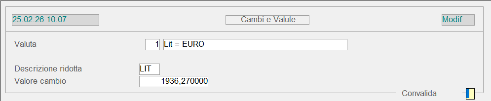 L'elenco delle monete disponibili è attivabile con il tasto F10 dell'help in linea, digitato in corrispondenza della Valuta. Il campo Descrizione ridotta, liberamente modificabile dall'utente, è utilizzato nelle funzioni d'Interrogazione e Stampa.