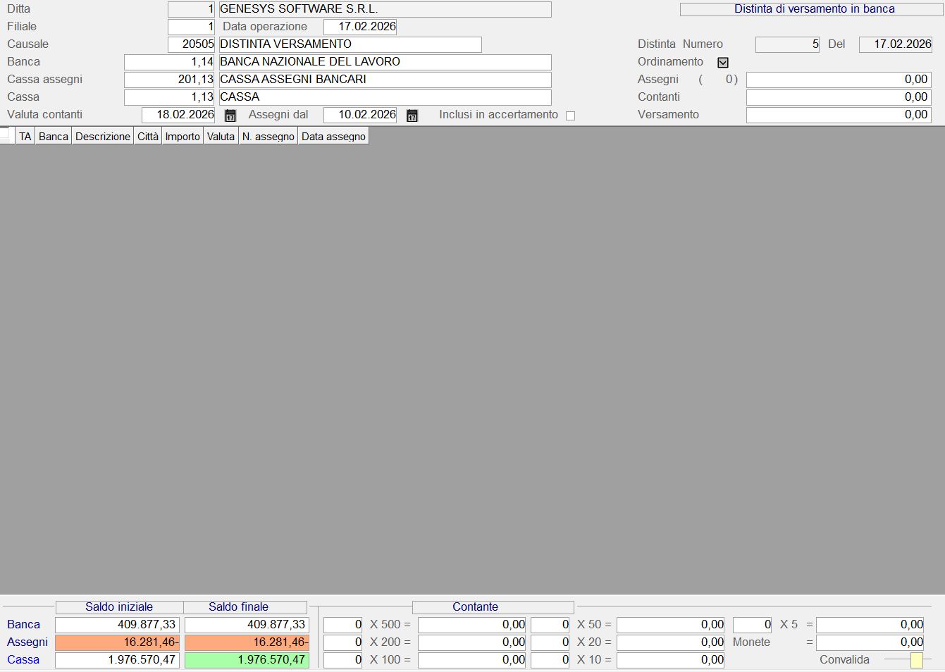 Impostando il tasto Invio, si ottiene in un data-grid l'elenco degli Assegni corrispondenti ai parametri richiesti, se presenti a sistema, altrimenti il cursore si posiziona nella parte inferiore della videata, per procedere con la compilazione della Distinta dei Contanti da versare.