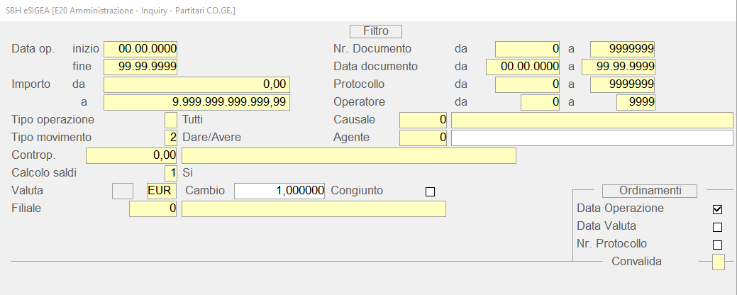 Confermando 0 e 9.999.9999.999.999,99, rispettivamente come Importo iniziale e Importo finale, saranno visualizzati tutti i movimenti indipendentemente dal loro ammontare.