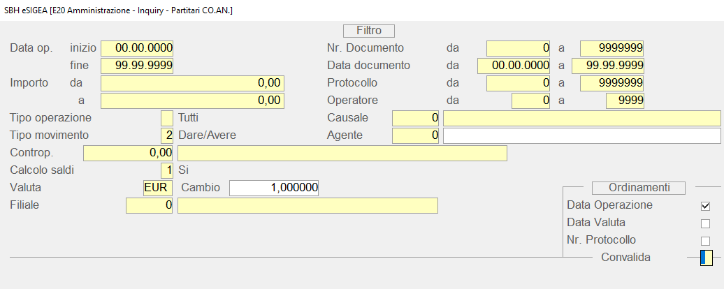 Confermando 0 e 9.999.9999.999.999,99, rispettivamente come Importo iniziale e Importo finale, saranno visualizzati tutti i movimenti indipendentemente dal loro ammontare.
