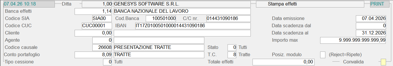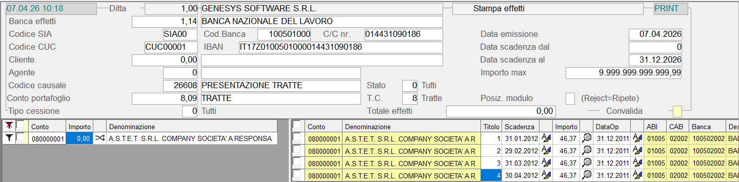 Dopo aver impostato i campi richiesti nella videata di selezione, si ottiene la lista degli Effetti in modalità data-grid: dopo aver selezionato tutte o solo alcune delle righe visualizzate, impostando il tasto Convalida (Accept o F12), si avvia la fase di stampa.