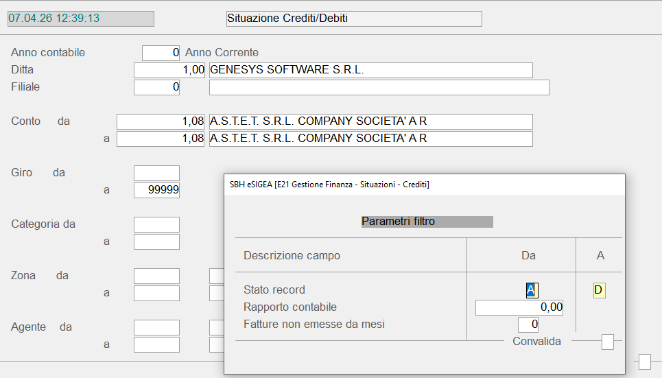 L'accesso alle stampe suesposte si realizza nella medesima videata. Inserito il codice Ditta, il cursore si posiziona sul campo corrispondente all'ordinamento selezionato da menù, in modo da permettere l'impostazione del range di conti, piuttosto che di categorie, zone o agenti, da considerare in fase di stampa. Indipendentemente dall'ordinamento prescelto, in corrispondenza del campo Convalida si attiva con il tasto field back