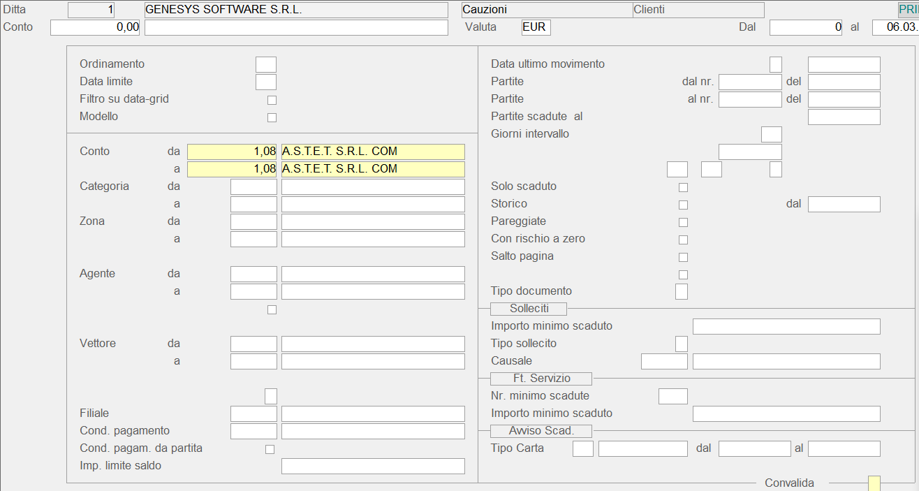 Questa funzione consente di selezionare le modalità di stampa relative alle cauzioni, scegliendo, a livello di menù, tra Clienti e Fornitori.