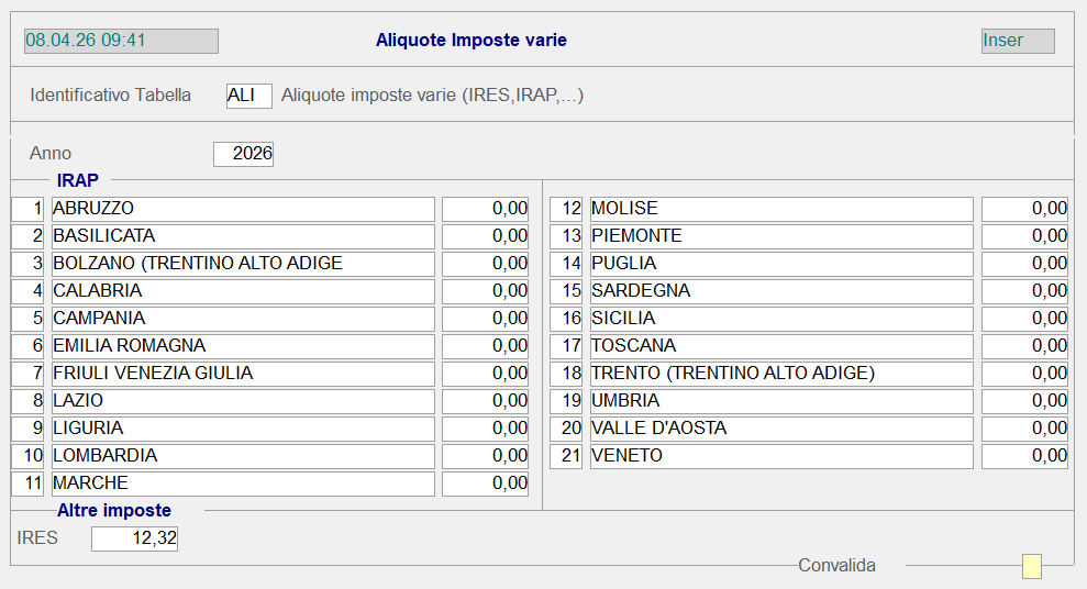 Questa tabella è predisposta all'inserimento delle aliquote IRAP, per Regione e Anno, e IRES per Anno. Le aliquote saranno assunte in fase di generazione dell'Ammortamento ai fini civilistici e fiscali.