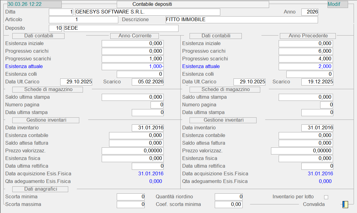 I dati visualizzati in questa sezione sono aggiornati dalla funzione di Generazione Inventario alla Data e indicano la data in cui è stato generato l'Inventario di fine anno e l'Esistenza Contabile rilevata. L'Esistenza Fisica invece, è aggiornata dalle funzioni di Acquisizione Esistenza Fisica e Immissione Inventario Fisico, utili per la stampa delle differenze inventariali.