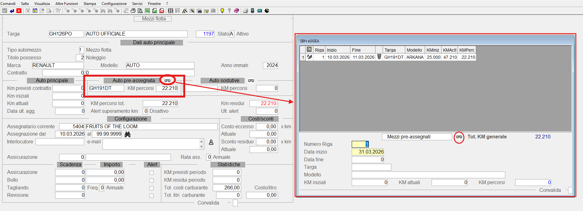 Una volta inserita la vettura ufficiale, in fase di inserimento di quest'ultima, sarà possibile indicare l'auto in stato pre-assegnata (tramite ricerca per targa) che verrà disattivata e azzerata (dati dei km messi a zero), ma associata al mezzo definitivo e visibile nell'apposita sezione con i dati dei km IN PRE-ASSEGNAZIONE.