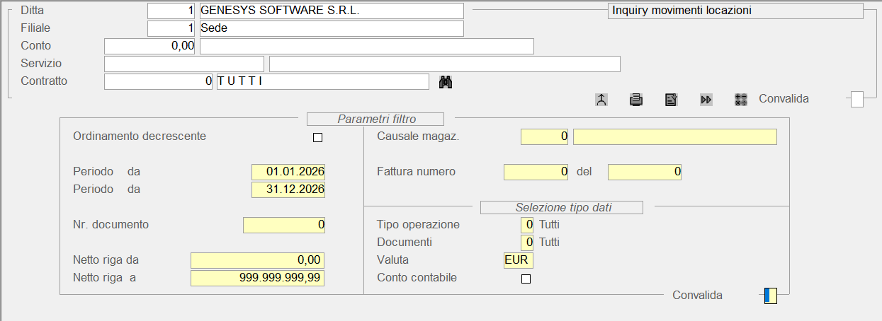 Questa funzione visualizza in modalità data-grid solo i movimenti di magazzino relativi alle Locazioni passive, con possibilità per l'Utente d'impostare specifici parametri di filtro. Inoltre, l'indicatore Documenti permette di scegliere se visualizzare tutti i movimenti o solo quelli da fatturare (esclusi i CAF e i relativi BAF).