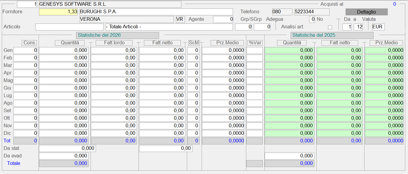 La Gestione Statistiche consente di ottenere delle situazioni riepilogative sul totale fatturato dai fornitori, con possibilità di analizzare anche gli acquisti, relativi ad un singolo prodotto o ad una specifica categoria merceologica. Sulla base di queste informazioni inoltre, la procedura provvede a calcolare una percentuale di variazione, rapportando il totale fatturato di ogni singolo mese, al corrispondente dell'anno precedente.