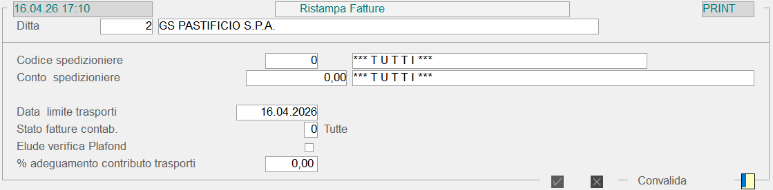 È possibile indicare lo Spedizioniere per il quale ristampare la Fattura oppure lasciare a 0 (zero) il campo per includerli tutti.