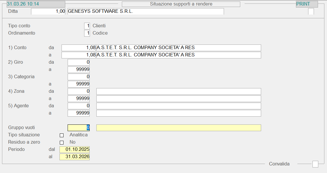 Questa funzione riepiloga la Situazione Supporti dei Clienti o Fornitori, con possibilità di generare una Stampa Analitica o Sintetica, in formato TXT o Laser.