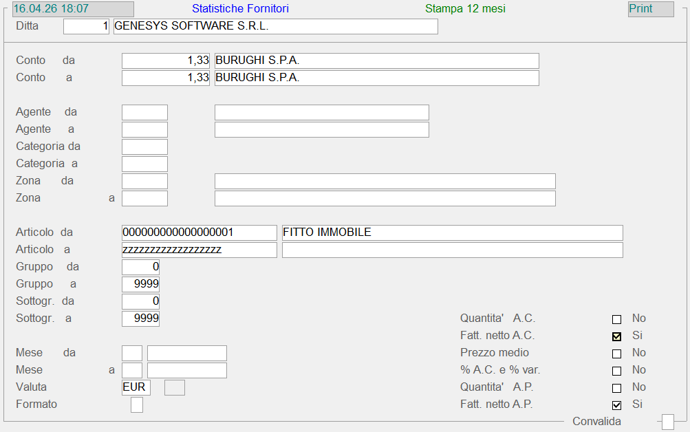 La funzione di Stampa prevede la possibilità di generare le statistiche, con riferimento ad un singolo fornitore o ad una precisa categoria di fornitori, entrambi gli ordinamenti sono selezionabili da menù.