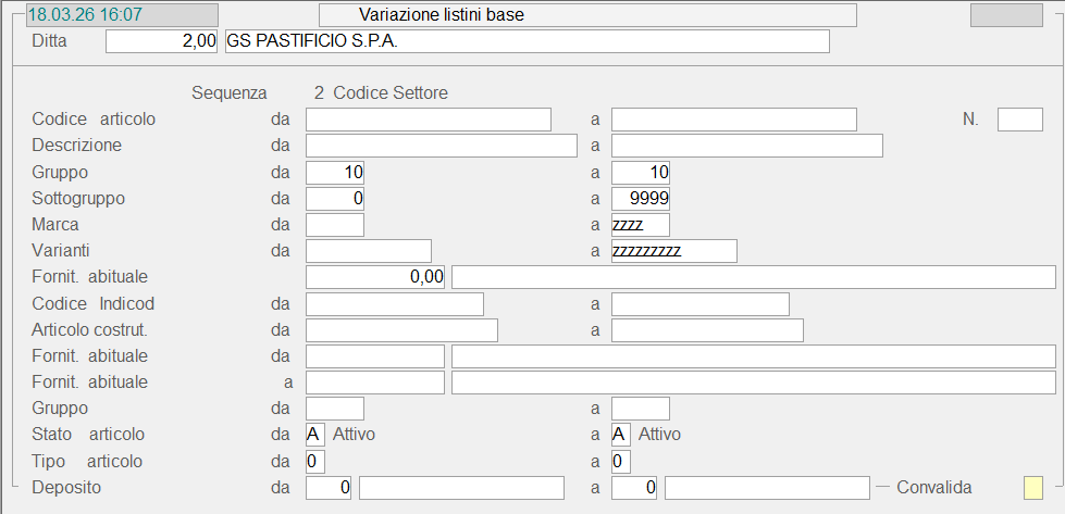 - indicata opportunamente la Sequenza, il cursore si posiziona sul corrispondente campo per l'inserimento del range degli Articoli da variare.