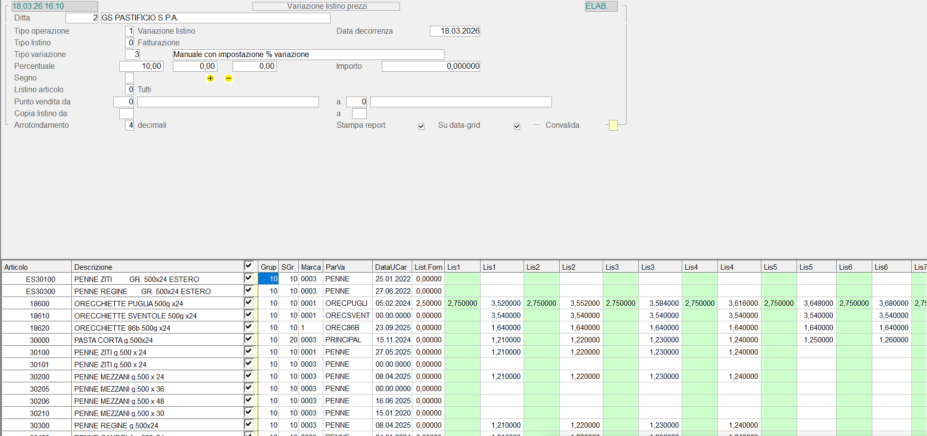 Con la convalida dei dati immessi, si accede alla videata per l'impostazione dei criteri di variazione dei Listini. I campi previsti sono: