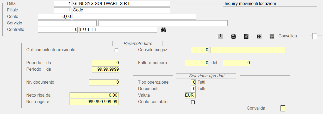 Questa funzione visualizza, in modalità data-grid, i movimenti di magazzino relativi alle Locazioni attive, con possibilità d'impostare specifici parametri, in modo da filtrare i risultati dell'inquiry.