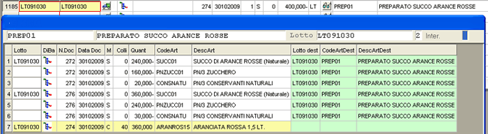 • i movimenti di scarico a produzione dei Componenti impiegati nella produzione dell'Articolo «PREP01 - Preparato Succo Arance Rosse» con codice Lotto «LT091030»