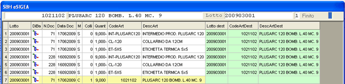 Se invece s'interroga un Componente, ossia una riga su cui sono presenti sia il Lotto di Produzione che quello di Destinazione, si otterrà l'elenco di tutti gli Articoli per i quali è stato impiegato. È visualizzata in giallo la movimentazione relativa al Lotto di Destinazione: