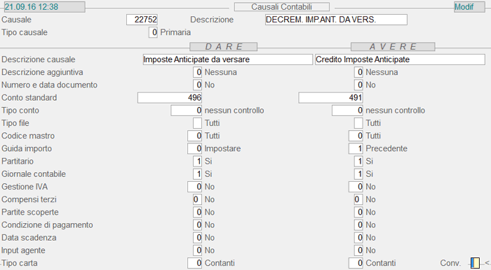 Causale 22.752 - Decremento Imposte Anticipate da Versare