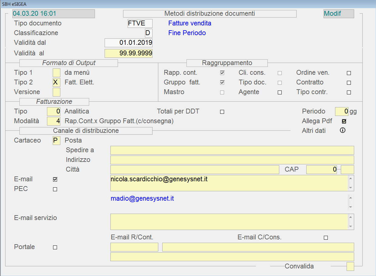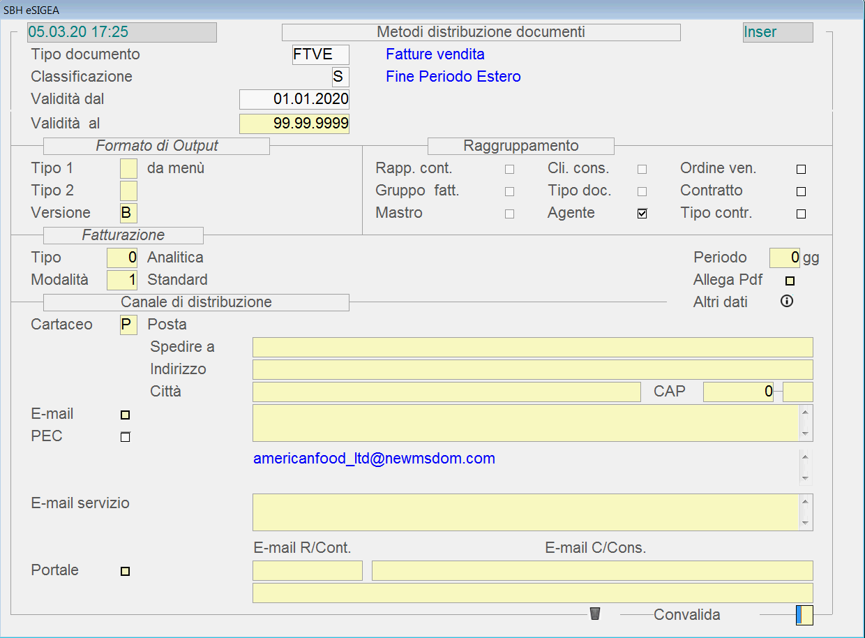 Implementata la gestione dei Metodi di Distribuzione nell'Anagrafica Clienti, vale a dire la possibilità di definire, solo per i Clienti di fatturazione, tutti i dati necessari all'emissione automatica delle Fatture di fine periodo e/o alla generazione di un Flusso elettronico (Rifatturazione, EDI, Fattura elettronica...)..