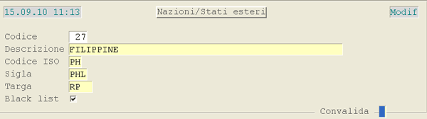 L'attivazione di questa check-box indica che lo Stato appartiene alla black-list. Il Codice 799 che identifica i Paesi NON Classificati, è stato flaggato a Sì.