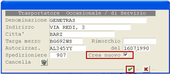 É possibile impostare come Vettore occasionale un Trasportatore già codificato nel sistema, attivandone la ricerca per Denominazione (tasto F1) o Targa (tasto F2), oppure inserire i dati di un nuovo Trasportatore, per il quale generare eventualmente una posizione nell'apposita Anagrafica (attivando il check-boxCrea nuovo). Se richiesta la generazione di un nuovo Trasportatore, questa sarà effettuata dopo aver convalidato i dati impostati nella window, quindi dopo aver cliccato sull'apposito pulsante Importante! Prima di procedere all'inserimento di un nuovo Trasportatore, si raccomanda all'Utente di controllare che il Soggetto NON sia già stato inserito, in modo da evitare inutili ridondanze. In ogni caso il programma, prima di creare una nuova Anagrafica, effettua un controllo sia sulla Denominazione che sulla Targa del Mezzo e se rileva una corrispondenza, fornisce apposita segnalazione all'Utente, che potrà assumere le informazioni impostate per creare una nuova Anagrafica (tasto F3) oppure continuare con l'inserimento dei dati, ma senza creare una nuova posizione (tasto Exit). Esempio: la condizione di Vettore occasionale emerge quando la ditta Genesys Software richiede il trasporto allo Spedizioniere TNT Traco e questo a sua volta, incarica la GENETRAS ad effettuarlo per suo conto. In un'ipotesi di questo tipo, dunque, sul Documento (Ordine o D.d.t.) dovrà essere impostato TNT Traco come Spedizioniere principale, perchè è questo soggetto che la ditta Genesys Software dovrà pagare, e GENETRAS come Spedizioniere occasionale.