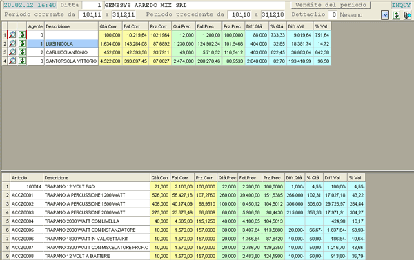 e , cliccando sui quali si ottiene, al piede della videata, un data-grid con il dettaglio delle informazioni. Questi pulsanti si rivelano utili, ad esempio, se come query principale è stato scelto di visualizzare i Conti di Consegna e poi si vuole anche, per un determinato Conto, il dettaglio delle Vendite per Articolo. La differenza tra il pulsante e il pulsante consiste nel fatto che, cliccando sul primo, si attiva nuovamente la window di selezione in cui l'Utente può scegliere quali informazioni visualizzare nel data-griddi dettaglio al piede della videata; mentre l'altro pulsante visualizza il dettaglio della riga richiesta, in base alle selezioni già effettuate.
