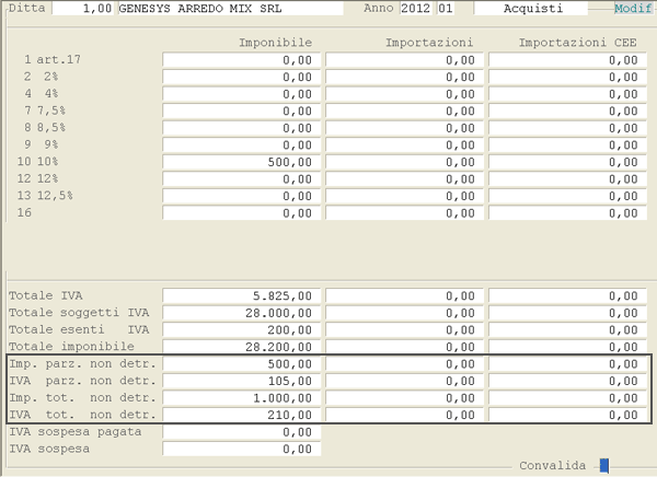 Le Voci relative all'Imponibile e all'Imposta non detraibile sono state suddivise in totalmente indetraibile e parzialmente indetraibile, allo scopo di assolvere più chiaramente all'obbligo di Dichiarazione annuale IVA.