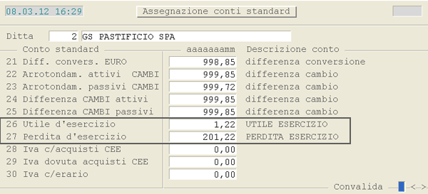 Controllo saldi Rilevazione utile/perdita A seguito di questa ottimizzazione, le 5 fasi in precedenza richieste per effettuare la chiusura e l'apertura dei Conti sono state unificate, comportando notevoli vantaggi pratici all'Operatore, che potrà anche avvalersi di una o di entrambe queste nuove funzionalità (Controllo saldi e Rilevazione utile/perdita). Per la rilevazione dell'utile o perdita d'esercizio, è necessario inserire preventivamente i nuovi Conti Standard 26 - Utile d'esercizio e 27 - Perdita d'esercizio, perchè il programma ne controlla l'esistenza.