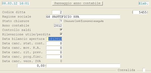 Esaminiamo nel dettaglio la fase Chiusura e Apertura Conti e le nuove funzionalità implementate. Nella videata d'accesso alla funzione, sono stati introdotti due nuovi check-box per il controllo saldi e la rilevazione dell'utile o della perdita.