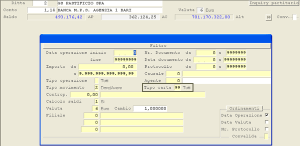 Nella funzione d'Inquiry Partitari Co.Ge. è stato implementato il filtro sul Tipo Carta, nel caso d'interrogazione di un Conto disponibilità liquide. A seguito di questa implementazione, è stata aggiornata anche la window d'impostazione parametri: