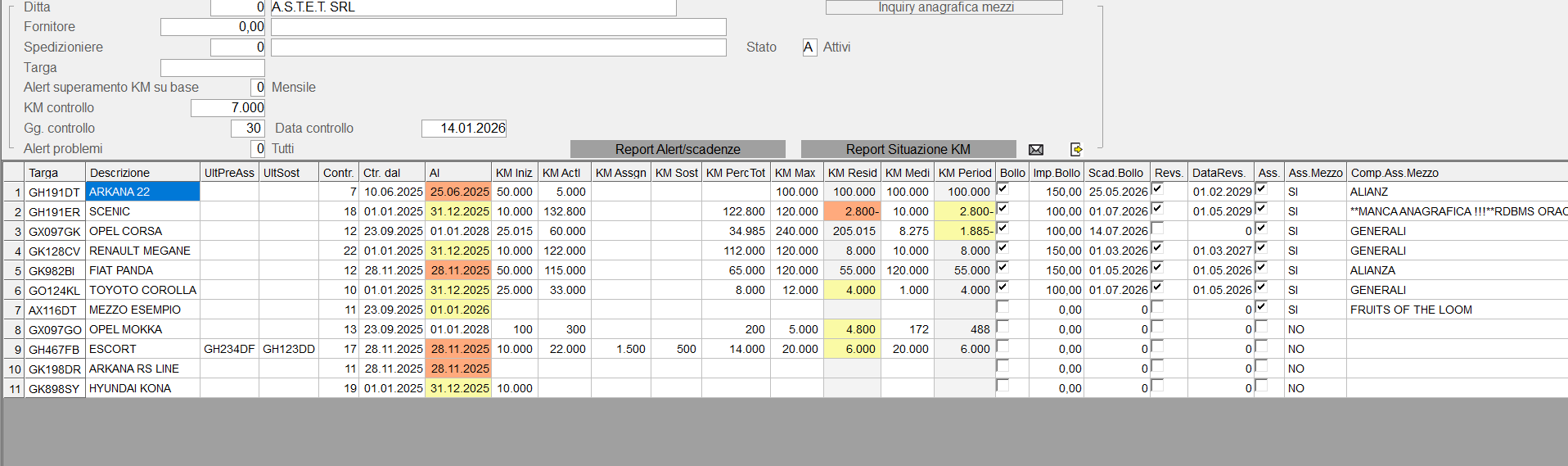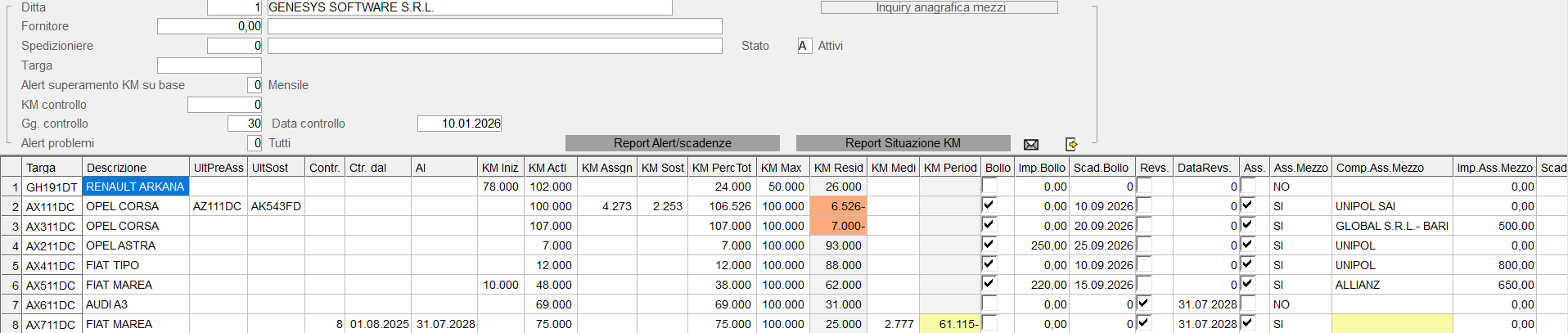 - Periodo al -> Mesi Controllo: numero mesi indietro da calcolare per avere la situazione a uno/due/tre mesi prima, in questo caso il campo "km attuali" per ciascun mezzo sarà preso dallo storico degli import alla data calcolata.