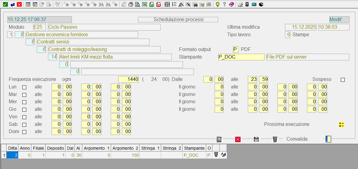 Il report della situazione dei km può essere elaborato e inviato via mail all'interlocutore con il codice 1811 ( Respons. contratti passivi) dalla schedulazione processi (EE0\1.20 Servizi di eSIGEA\20 Utility\21 Schedulazione processi).