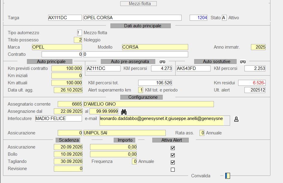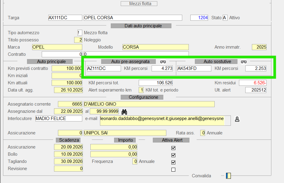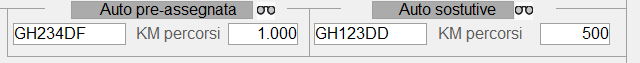 Le auto pre-assegnate (di solito presente un'auto solo ) e le auto sostitutive e i rispettivi km inziali e attuali sono disponibili nella videata principale del mezzo principale: