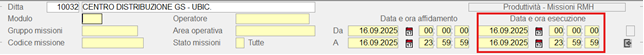 Oltre all’impostazione delle date e ore di inizio e fine affidamento sarà possibile impostare anche le date e ore di inizio e fine esecuzione. Queste ultime sono impostate come quelle di affidamento e vanno modificate qualora si presuma che alcune missioni possano essere state eseguite uno o più giorni dopo le relative data e ora affidamento. In sostanza, per analizzare la produttività di un giorno specifico è necessario che la data di affidamento sia antecedente di n giorni quella di esecuzione dove n deve considerare anche i giorni non lavorativi. Se per esempio il giorno da osservare è lunedì e sabato e domenica non si lavora, la data di affidamento deve essere di almeno 3 giorni prima rispetto alla data di esecuzione.