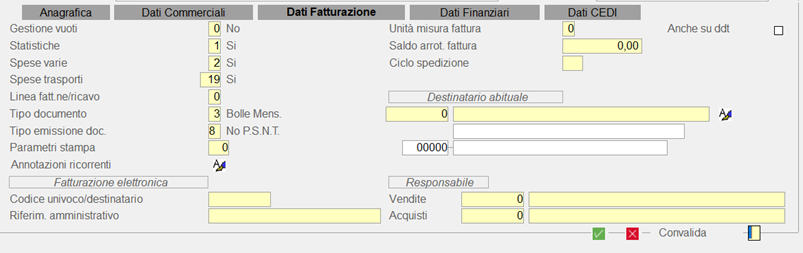 Nella sezione Dati Fatturazione dell'anagrafica clienti è stato implementato il codice delle spese trasporto da indicare portandolo dall’attuale 9 a 19. Pertanto, saranno considerate le voci complementari comprese tra i codici 99.850 e 99.869.
