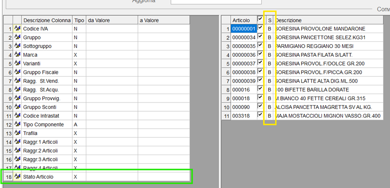 Dopo aver convalidato, il programma per ogni articolo verificherà che lo stato inserito nella colonna “da Valore” corrisponda con quello della colonna “S” (evidenziata in giallo), se non corrisponde il valore dello stato non verrà aggiornato. Sull’anagrafica dell’articolo verranno aggiornate anche la data e il flag di modifica.
