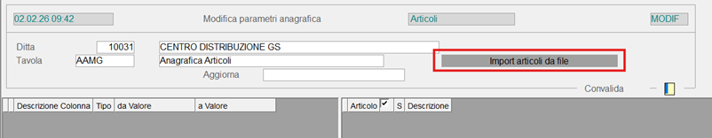 Implementata all’interno della funzione di modifica dei parametri “Dati Anagrafici”, se l’utente seleziona la tavola AAMG – Anagrafica articoli, la possibilità di effettuare l’import degli articoli tramite file.
