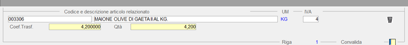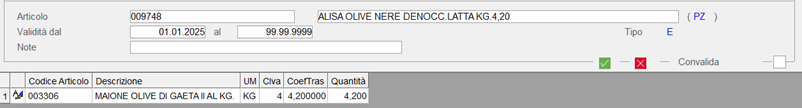 La tabella di relazione, quindi, deve essere intestata all’articolo OLIVE IN CESTE e deve avere come componente l’articolo OLIVE NERE SFUSE specificando come coefficiente di trasformazione 4,20 (peso delle olive contenute nel cestello).