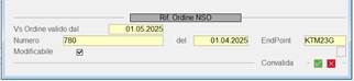 Nella prima mask, cliccando il pulsante “Ordine NSO”, è visualizzata la window di gestione nella quale, tra gli altri dati, è possibile indicare la data di inizio validità in corrispondenza della label “Vs Ordine valido dal”.