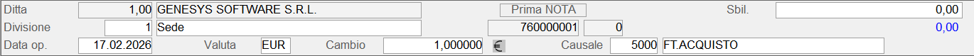 La Causale Contabile che apre l'Operazione deve essere necessariamente Primaria. Durante la registrazione, sarà sempre evidenziata la descrizione della Causale, nell'apposito campo al piede della videata.