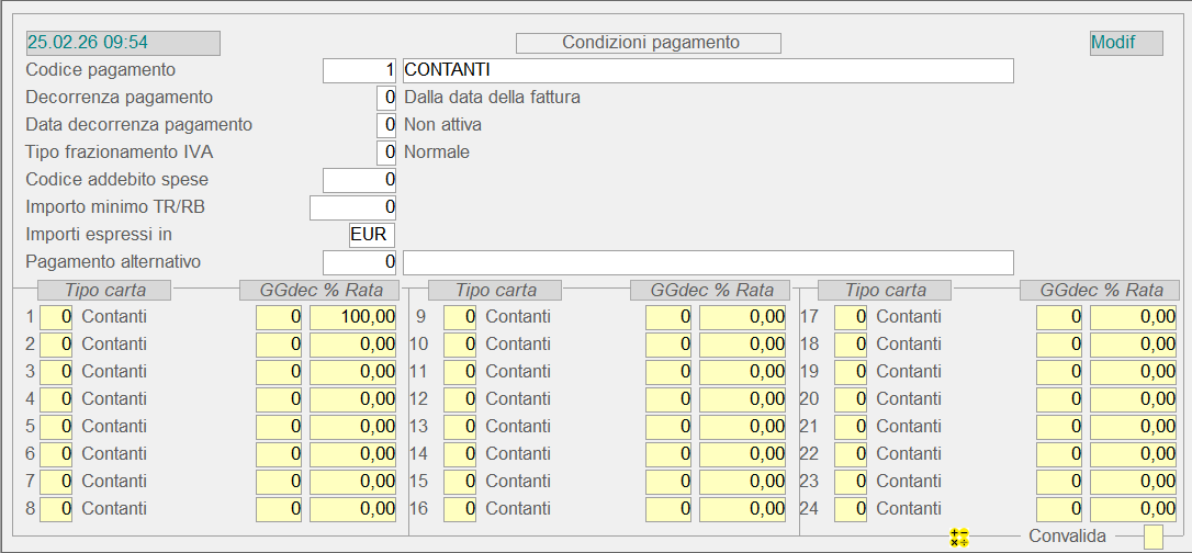 In questa tabella sono definite le diverse Condizioni di Pagamento praticate dalle Ditte del sistema, le informazioni in essa inserite sono utilizzate per controllare le forme e i tempi di pagamento delle Partite Scoperte.