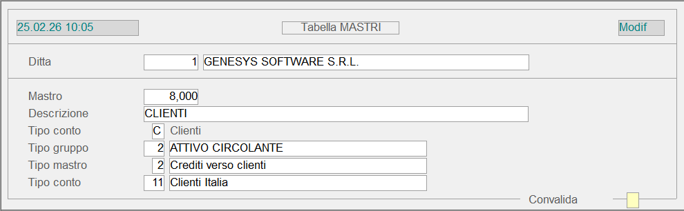 Il Mastro, composto da 2 cifre, identifica un insieme omogeneo di Conti ed è utile, quindi, ad agganciare gli equivalenti elementi del Piano dei Conti.